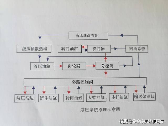 液壓油經(jīng)過(guò)齒輪泵加壓到多路轉(zhuǎn)向閥,通過(guò)操縱相關(guān)手柄控制對(duì)應(yīng)的閥路把液壓油輸送到個(gè)控制油缸,馬達(dá),而后馬達(dá)完成挖掘,行走,輸送等動(dòng)作。當(dāng)不工作是,液壓油經(jīng)多路閥向閥中間油道經(jīng)過(guò)濾清器過(guò)濾再又散熱器散熱后回流至油箱內(nèi)。
